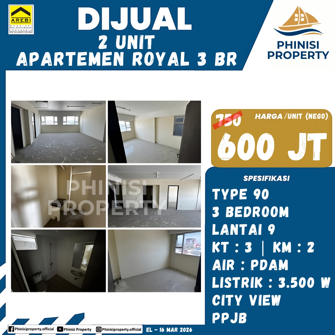 Apartemen di Royal ini adalah pilihan investasi yang sangat menarik. Terletak di lantai 9, unit tipe 90 ini memiliki 3 kamar tidur (3 Bedroom) dan 2 kamar mandi, sangat cocok untuk keluarga yang mencari hunian nyaman di pusat kota. Apartemen ini menawarkan pemandangan kota yang menawan, serta dilengkapi dengan fasilitas air PDAM dan daya listrik 3500 watt. Legalitasnya yang berupa PPJB juga memberikan kepastian dalam bertransaksi. Jangan lewatkan kesempatan untuk memiliki unit apartemen di lokasi premium yang menawarkan kenyamanan dan gaya hidup modern.