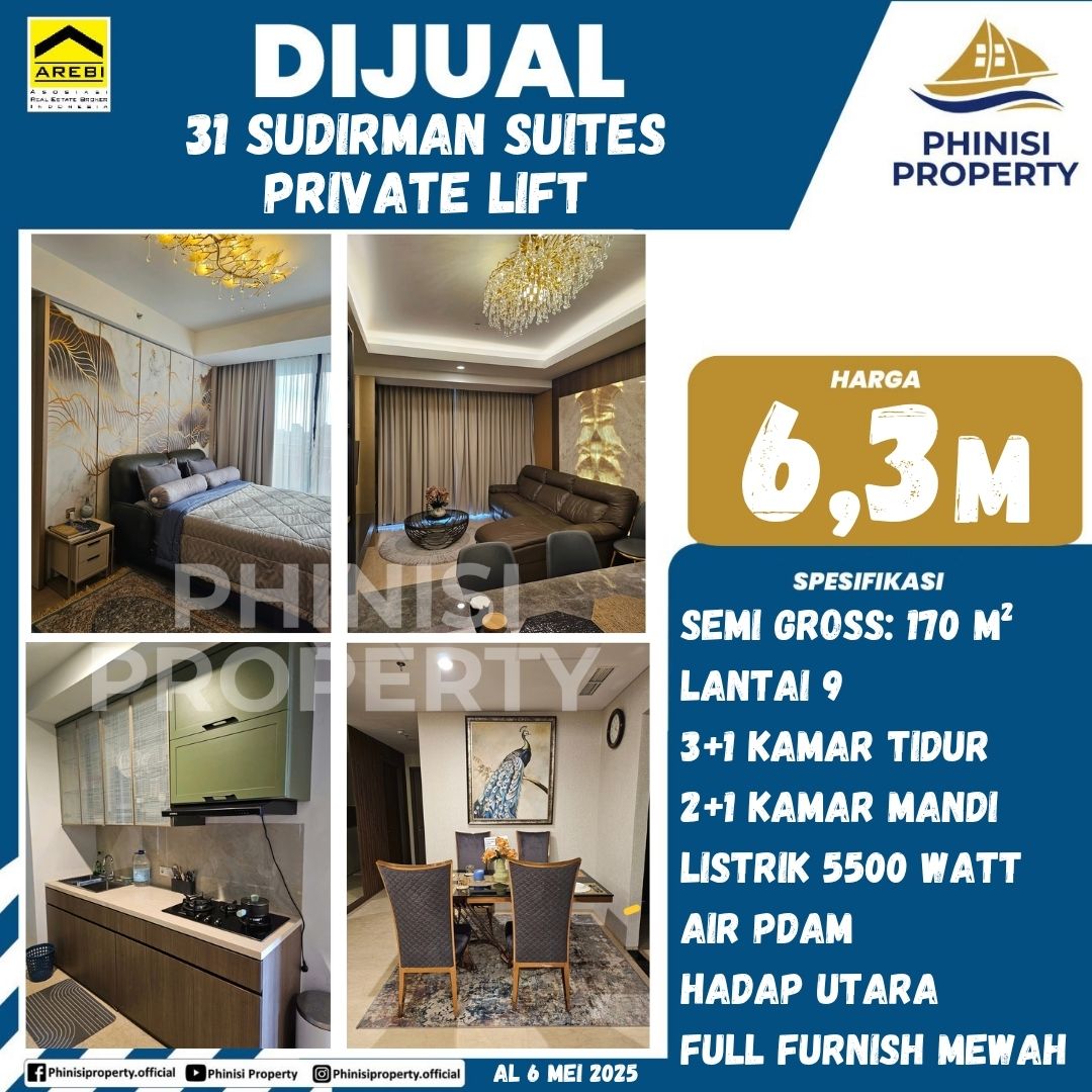 Cari apartemen mewah di Makassar? Apartemen 31 Sudirman unit istimewa siap huni! Dengan luas 170² di lantai 9, unit ini dilengkapi 3+1 Kamar Tidur dan 2+1 Kamar Mandi. Nikmati fasilitas full furnished, air PDAM, listrik 5.500 VA, dan view langsung kolam renang yang menawan.