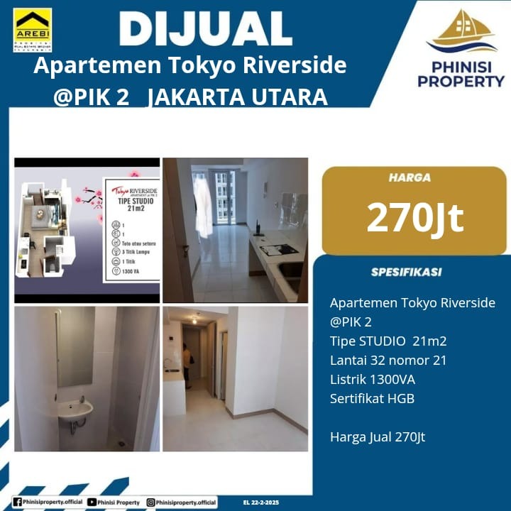 Dijual apartemen siap huni di Tokyo Riverside, PIK 2, Jakarta Utara, yang sangat ideal untuk investasi maupun hunian pribadi. Apartemen tipe Studio ini memiliki luas 21 m² dan berlokasi strategis di lantai 32 dengan nomor unit 21, menawarkan pemandangan kota yang menawan. Dilengkapi dengan daya listrik 1300 VA dan status legalitas Sertifikat HGB, properti ini menjanjikan keamanan dan kenyamanan tinggal. Investasi di kawasan PIK 2 sangat menjanjikan mengingat perkembangan pesat dan fasilitas yang lengkap di area tersebut. Unit ini cocok untuk Anda yang mencari hunian praktis di lokasi premium, ataupun sebagai aset yang bisa disewakan dengan keuntungan maksimal. Dengan luas 21 m² dikalikan dengan harga per meter perseginya, properti ini menawarkan nilai yang sangat kompetitif untuk unit di kawasan eksklusif ini.
