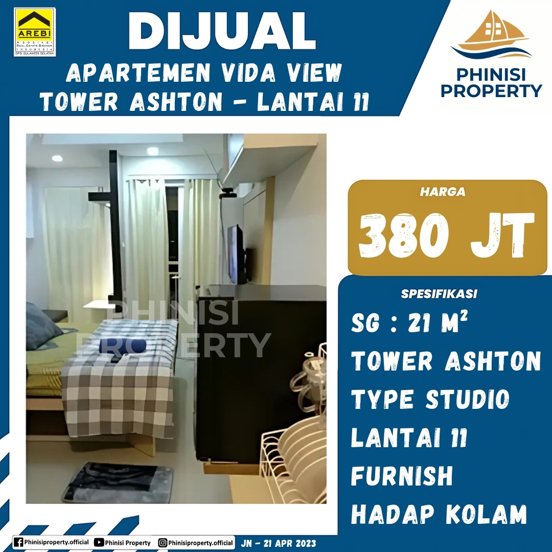 Dijual sebuah unit apartemen di Vida View Apartment, Tower Ashton, yang berada di lantai 11. Unit ini bertipe studio dengan luas 21 meter persegi. Apartemen ini dijual dalam kondisi furnish dan memiliki pemandangan langsung ke arah kolam renang. Apartemen ini sangat cocok untuk investasi atau hunian pribadi karena lokasinya yang strategis dan sudah siap huni.