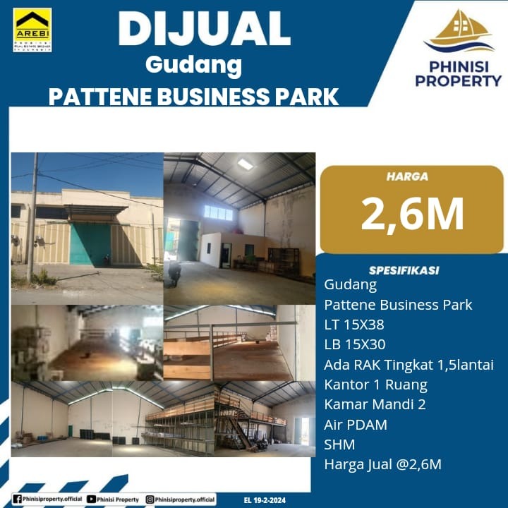 Mencari properti komersial yang menjanjikan di kawasan bisnis? Gudang di Pattene Business Park adalah pilihan yang tepat. Gudang ini berdiri di atas tanah seluas 15 x 38 meter dan luas bangunan 15 x 30 meter. Bangunan ini dilengkapi dengan rak bertingkat 1,5 lantai, 1 ruang kantor, dan 2 kamar mandi. Dengan fasilitas air PDAM dan Sertifikat Hak Milik (SHM), gudang ini sangat cocok untuk berbagai jenis usaha dan merupakan investasi properti yang sangat menguntungkan di lokasi yang strategis.