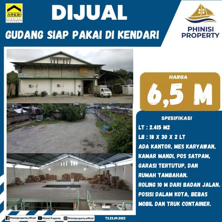 Gudang multifungsi ini adalah aset yang sangat berharga untuk bisnis Anda, berlokasi strategis di Kendari. Dengan luas tanah 2.415 m², properti ini menawarkan ruang yang sangat luas untuk operasional. Luas bangunan gudang adalah 18 meter x 30 meter dengan dua lantai, memberikan total luas bangunan sebesar 1.080 m². Fasilitas yang tersedia sangat lengkap, termasuk kantor, mes karyawan, kamar mandi, pos satpam, garasi tertutup, dan rumah tambahan, yang semuanya mendukung kelancaran kegiatan bisnis. Gudang ini memiliki akses yang mudah, berjarak hanya 10 meter dari badan jalan utama dan berada dalam kota, sehingga bebas dilalui oleh mobil dan truk kontainer. Ini adalah kesempatan ideal untuk memiliki gudang yang siap pakai dan lengkap, menjamin efisiensi logistik dan operasional bisnis Anda.