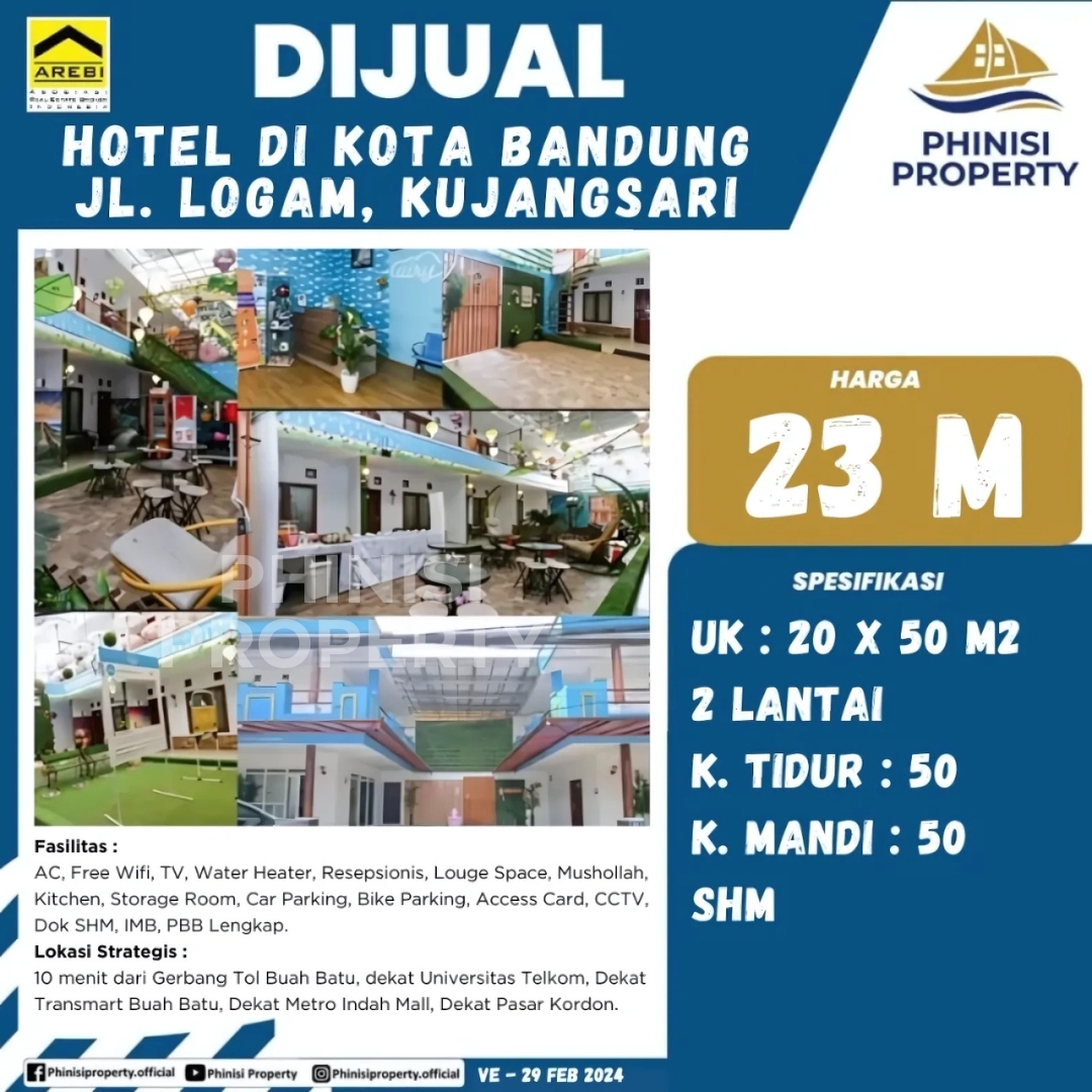 Peluang investasi properti komersial yang menjanjikan! Dijual hotel di Kota Bandung, Jl. Logam, Kujangsari, dengan harga 23 Milyar. Hotel ini memiliki ukuran (UK) 20 x 50 m², 2 lantai, 50 kamar tidur, dan 50 kamar mandi. Status kepemilikan SHM (Sertifikat Hak Milik), IMB, dan PBB lengkap.