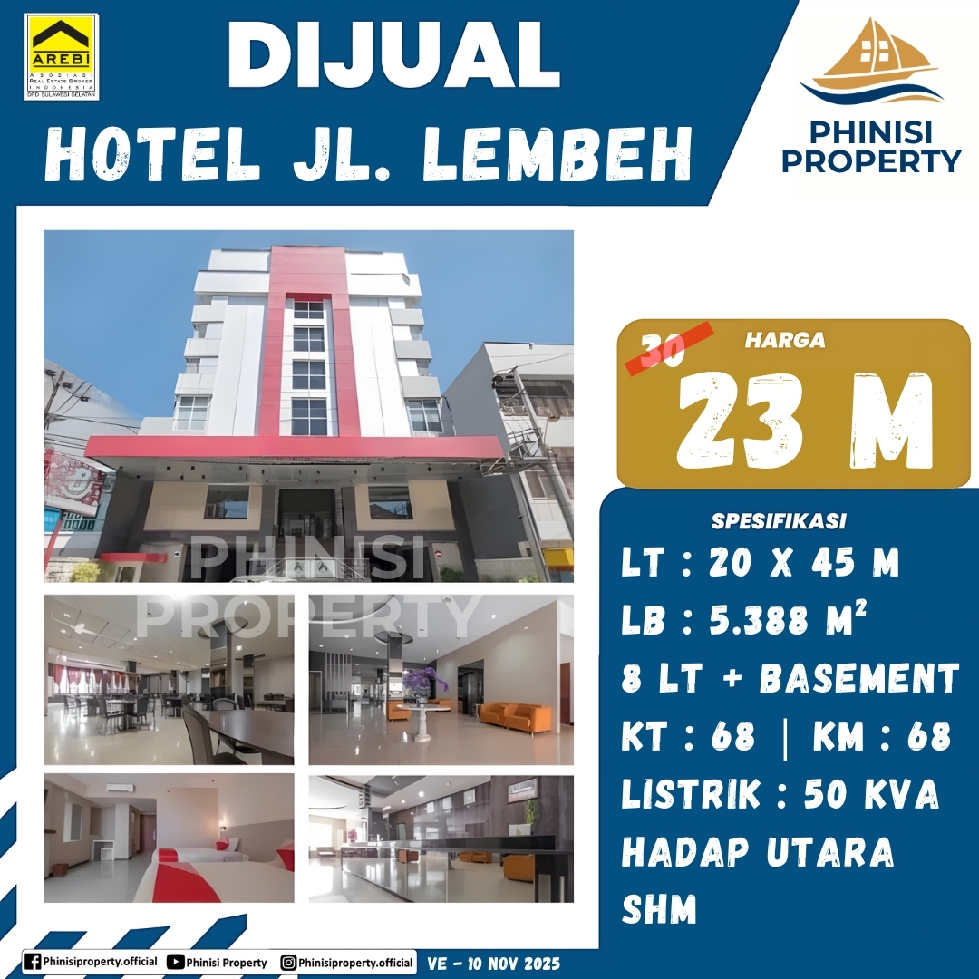 Raih peluang investasi properti komersial berskala besar dengan mengakuisisi Hotel di Jalan Lembeh, sebuah properti yang siap operasional dan berlokasi sangat strategis. Hotel ini memiliki spesifikasi yang impresif, dibangun di atas Luas Tanah 20 x 45 meter dengan total Luas Bangunan 5.388 M². Bangunan terdiri dari 8 Lantai dan dilengkapi Basement, menawarkan ruang yang optimal untuk fasilitas dan operasional. Hotel ini menyediakan 68 Kamar Tidur dan 68 Kamar Mandi, menjamin kenyamanan tamu dan potensi hunian tinggi. Fasilitas pendukung operasional sangat memadai, termasuk daya listrik besar 50 KVA. Properti menghadap Utara dan legalitasnya terjamin dengan sertifikat SHM (Sertifikat Hak Milik), menjadikannya aset bisnis yang kuat dan menguntungkan di kawasan yang ramai.