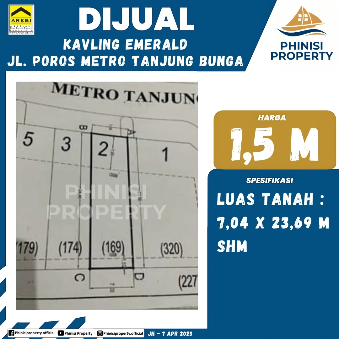 Dijual sebuah kavling siap bangun di kawasan Emerald, Jalan Poros Metro Tanjung Bunga. Kavling ini memiliki dimensi 7,04 x 23,69 meter, dengan total luas 166,78 meter persegi. Dengan lokasinya yang strategis di poros jalan utama, kavling ini sangat ideal untuk dibangun menjadi hunian atau investasi yang menjanjikan.