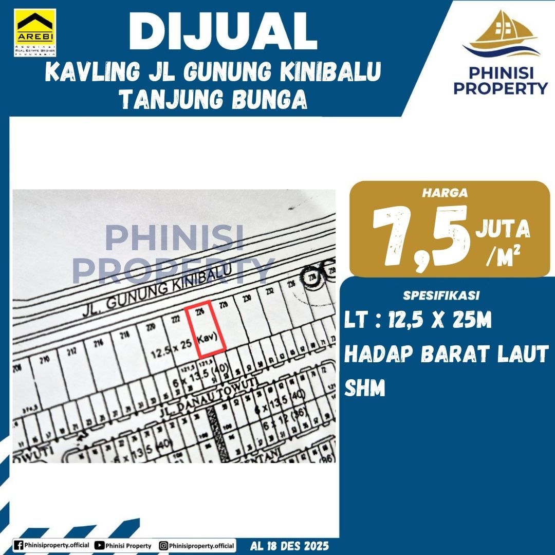 Dijual Kavling Jl. Gunung Kinibalu Tanjung BungaKavling siap bangun dengan lokasi yang strategis dan akses jalan yang mudah, cocok investasi. Hanya beberapa menit dari Jalan Metro Tanjung Bunga, salah satu jalan utama Makassar.