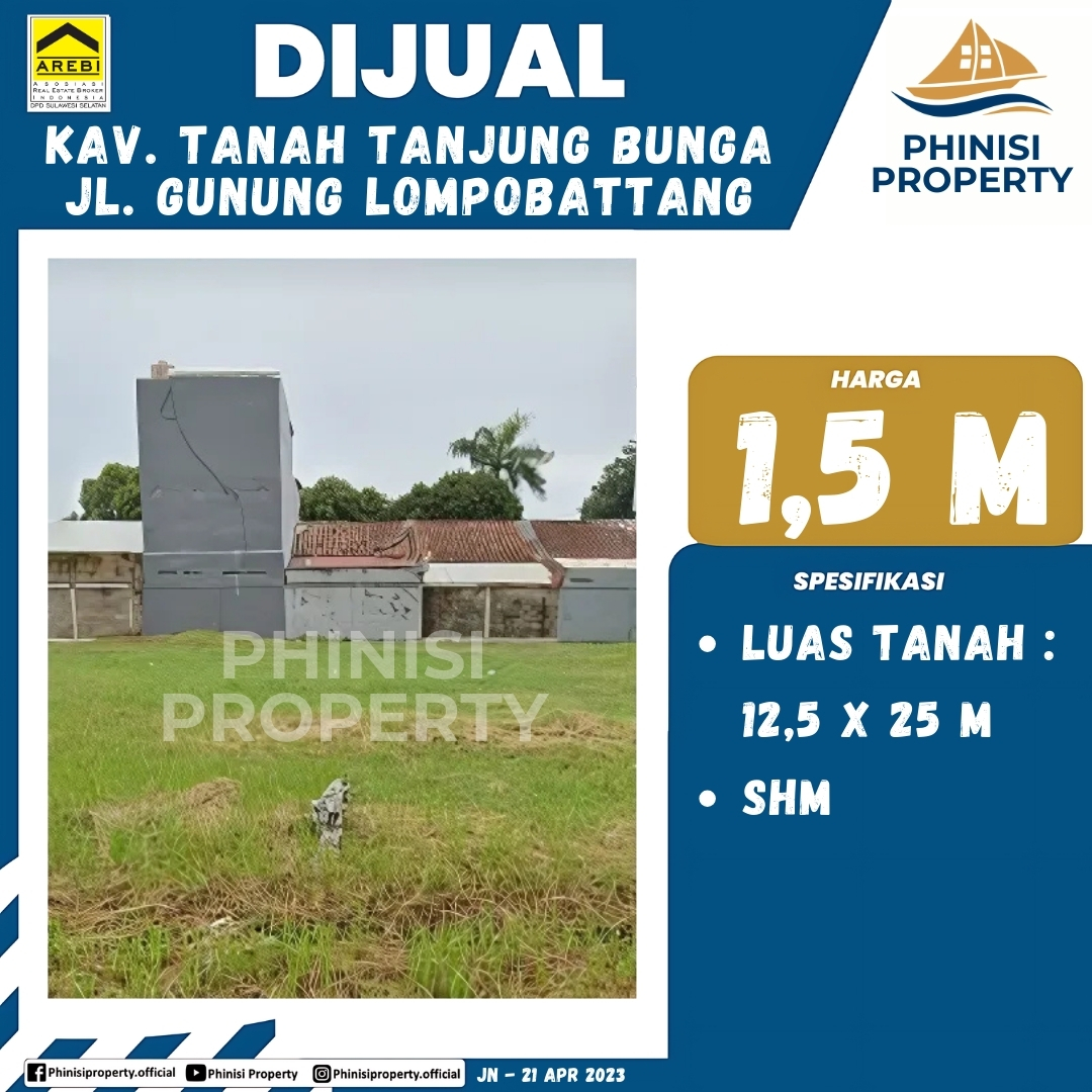 Dijual sebidang kavling tanah di kawasan elit Tanjung Bunga, tepatnya di Jalan Gunung Lompobattang. Tanah ini memiliki ukuran 12,5 x 25 meter, dengan total luas 312,5 meter persegi. Status kepemilikannya adalah Sertifikat Hak Milik (SHM). Lokasinya yang strategis dan berada di lingkungan perumahan yang sudah berkembang menjadikan kavling ini pilihan ideal untuk membangun hunian pribadi atau investasi jangka panjang.