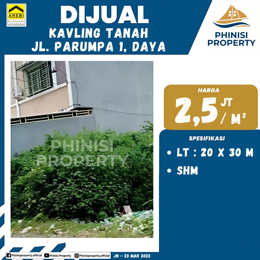 Dijual sebidang tanah yang berlokasi strategis di Jalan Parumpa 1, Daya. Tanah ini memiliki dimensi 20 x 30 meter, dengan total luas 600 meter persegi. Sertifikat kepemilikannya adalah Sertifikat Hak Milik (SHM). Lokasi tanah sangat prospektif karena berada di samping ruko yang sedang dalam pembangunan, menjadikannya pilihan investasi yang sangat baik untuk pengembangan bisnis atau properti.