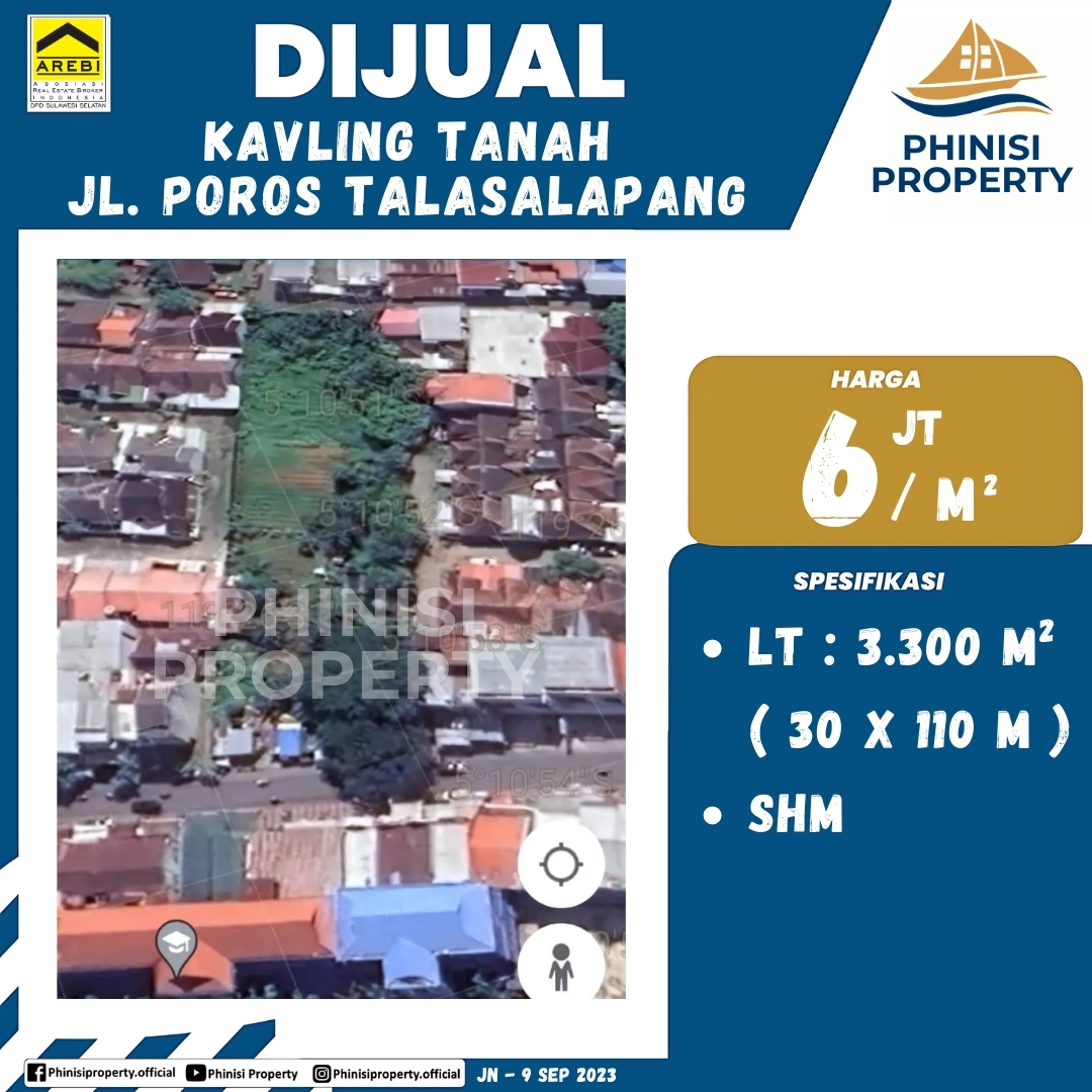Dijual sebidang kavling tanah dengan lokasi sangat strategis di Jalan Poros Talasalapang. Tanah ini memiliki luas total 3.300 meter persegi (30 x 110 meter). Dengan ukurannya yang sangat luas dan lokasinya yang berada di jalan utama, properti ini sangat ideal untuk pengembangan perumahan, kompleks ruko, gudang, atau properti komersial lainnya. Status kepemilikan tanah ini adalah Sertifikat Hak Milik (SHM).