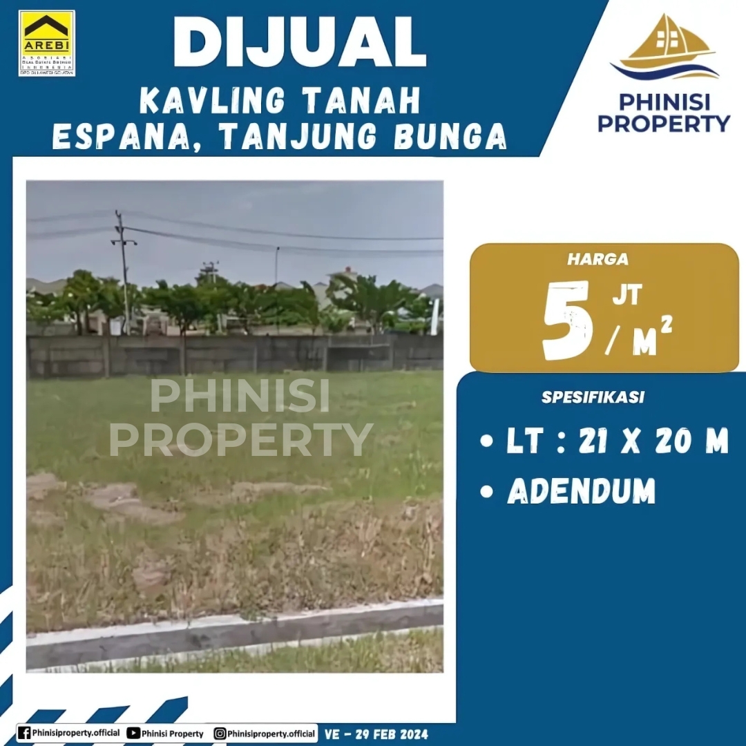 Dapatkan kesempatan untuk memiliki kavling tanah eksklusif di kawasan Espana, Tanjung Bunga, Makassar, sebuah lokasi strategis dan premium. Kavling ini memiliki dimensi ideal 21 x 20 meter, menawarkan luas yang lapang untuk membangun hunian impian Anda atau sebagai aset investasi jangka panjang di salah satu area paling diminati di Makassar. Dengan harga 5 Juta per meter persegi, kavling ini menjanjikan potensi pertumbuhan nilai yang signifikan. Dengan status kepemilikan 'Adendum' yang menandakan status legal yang jelas, kavling di Espana Tanjung Bunga ini adalah pilihan cerdas bagi Anda yang mencari properti di lokasi prima dengan prospek cerah di Makassar.