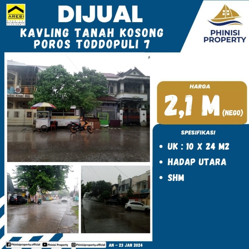 Miliki aset berharga dengan tanah kavling yang dijual di Poros Toddopuli 7. Berlokasi di area yang sangat prospektif, properti ini menawarkan potensi besar untuk dikembangkan menjadi hunian pribadi, kos-kosan, atau ruang usaha. Dengan ukuran 10x24 meter persegi, setara dengan 240 meter persegi, Anda memiliki lahan yang cukup luas untuk mewujudkan impian properti Anda. Menghadap ke arah utara, properti ini mendapatkan pencahayaan alami yang baik dan sirkulasi udara yang optimal. Dengan status kepemilikan SHM (Sertifikat Hak Milik), Anda tidak perlu khawatir tentang legalitas dan keamanan investasi. Jangan lewatkan kesempatan langka untuk memiliki properti di salah satu lokasi paling strategis dan dicari di Makassar.