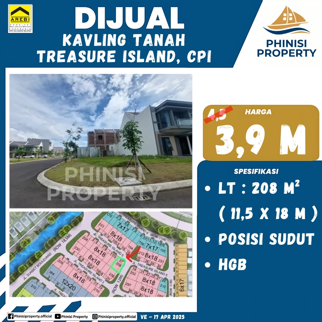 PHINISI PROPERTY dengan bangga mempersembahkan properti investasi yang sangat eksklusif: sebuah kavling tanah premium dengan posisi sudut yang berlokasi di Treasure Island, Citraland City Panakkukang (CPI), Makassar. Ini adalah kesempatan emas bagi Anda yang mencari lahan siap bangun untuk hunian impian atau investasi di salah satu kawasan paling bergengsi dengan konsep pulau buatan yang modern dan fasilitas lengkap, serta keuntungan strategis dari posisi sudut!
