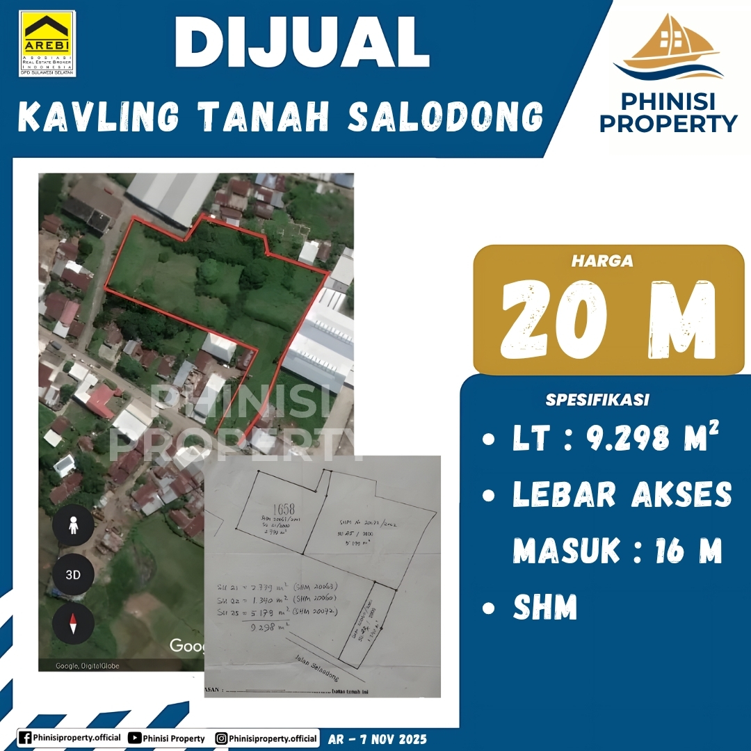 Sebuah peluang investasi properti skala besar kini tersedia di kawasan Salodong. Dijual tanah kavling seluas 9.298 m² dengan akses masuk yang sangat lebar, yaitu 16 meter, memudahkan mobilitas kendaraan berat. Tanah ini sangat ideal untuk pengembangan perumahan, pergudangan, atau proyek komersial lainnya. Dengan status Sertifikat Hak Milik (SHM), properti ini menawarkan keamanan dan jaminan legalitas penuh. Lokasi strategis dan luasnya lahan menjadikan properti ini pilihan yang sangat menjanjikan untuk investasi jangka panjang