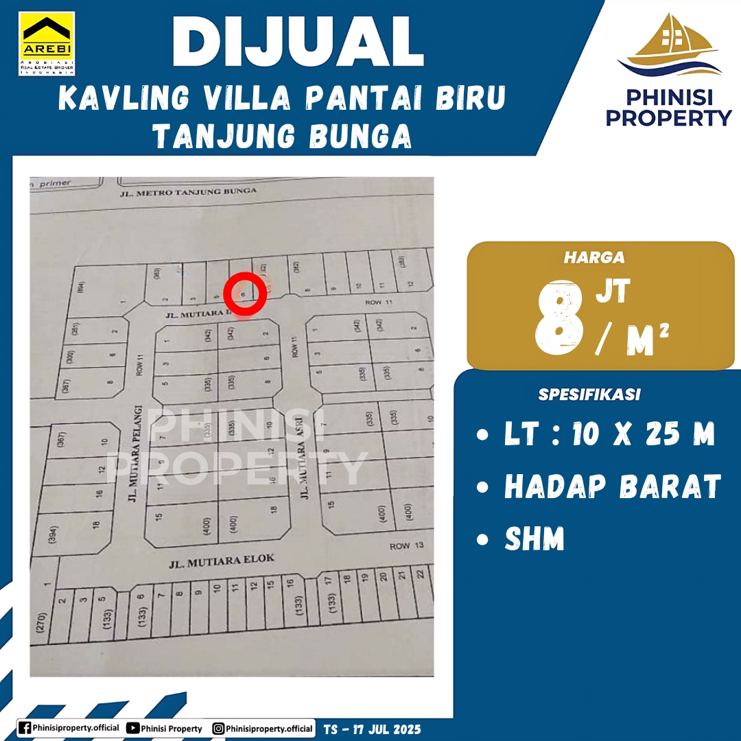 Mencari tanah dijual di lokasi prestisius Makassar? Kavling Villa Pantai Biru Tanjung Bunga adalah pilihan investasi properti terbaik untuk Anda! Tersedia kavling dengan luas tanah ideal 10 meter×25 meter, sangat cocok untuk membangun villa impian atau investasi jangka panjang. Lokasi strategis di Tanjung Bunga, salah satu kawasan elite dan berkembang pesat di Makassar, menjamin nilai investasi yang terus meningkat. Kavling ini menghadap ke Barat, memberikan pencahayaan alami yang baik. Status kepemilikan sudah Sertifikat Hak Milik (SHM), memastikan legalitas dan keamanan transaksi Anda. Dengan harga hanya 8 juta per meter persegi, ini adalah kesempatan langka untuk memiliki properti di lokasi favorit. Jangan lewatkan peluang emas ini untuk investasi properti di Makassar.