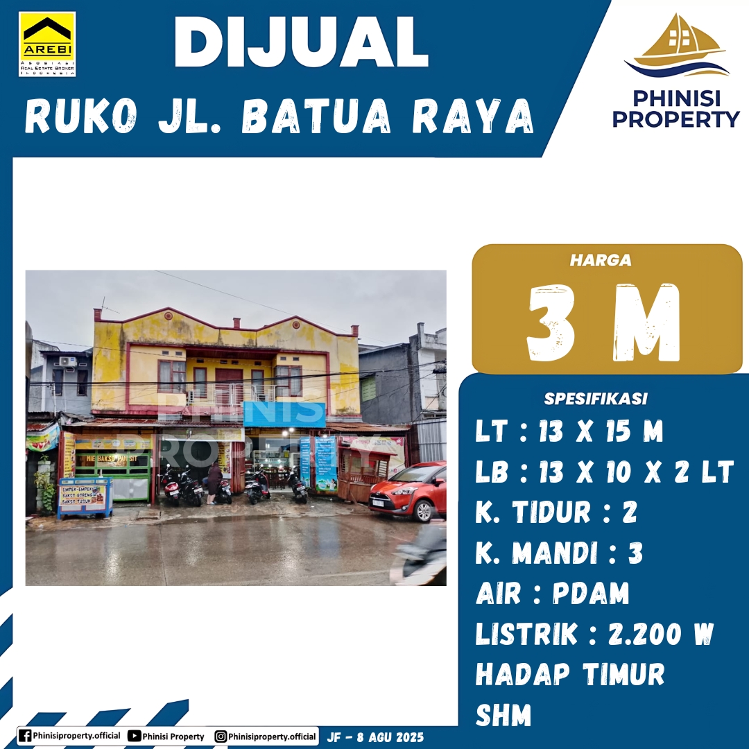 Dijual ruko dua lantai dengan lokasi sangat strategis di Jalan Batua Raya. Properti ini dibangun di atas lahan berukuran 13 m x 15 m, dengan total luas 195 meter persegi. Luas bangunannya adalah 13 m x 10 m, dirancang secara efisien untuk memaksimalkan ruang bisnis dan hunian.