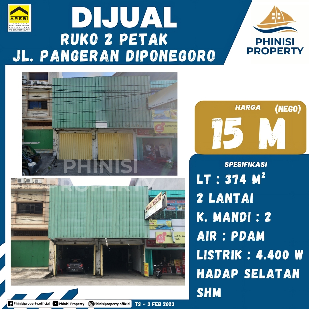 Ruko dua petak yang berlokasi strategis di Jl. Pangeran Diponegoro ini adalah pilihan investasi yang sangat menguntungkan. Dengan luas tanah (LT) 374 m², properti ini menawarkan ruang yang sangat luas untuk berbagai jenis usaha. Bangunan dua lantai ini dilengkapi dengan dua kamar mandi dan memiliki daya listrik 4.400 watt, serta pasokan air dari PDAM. Ruko ini menghadap ke selatan dan memiliki legalitas Sertifikat Hak Milik (SHM) yang menjamin keamanan transaksi. Dengan lokasinya yang premium dan luas yang besar, properti ini sangat cocok untuk bisnis skala besar, kantor, atau sebagai aset investasi jangka panjang.