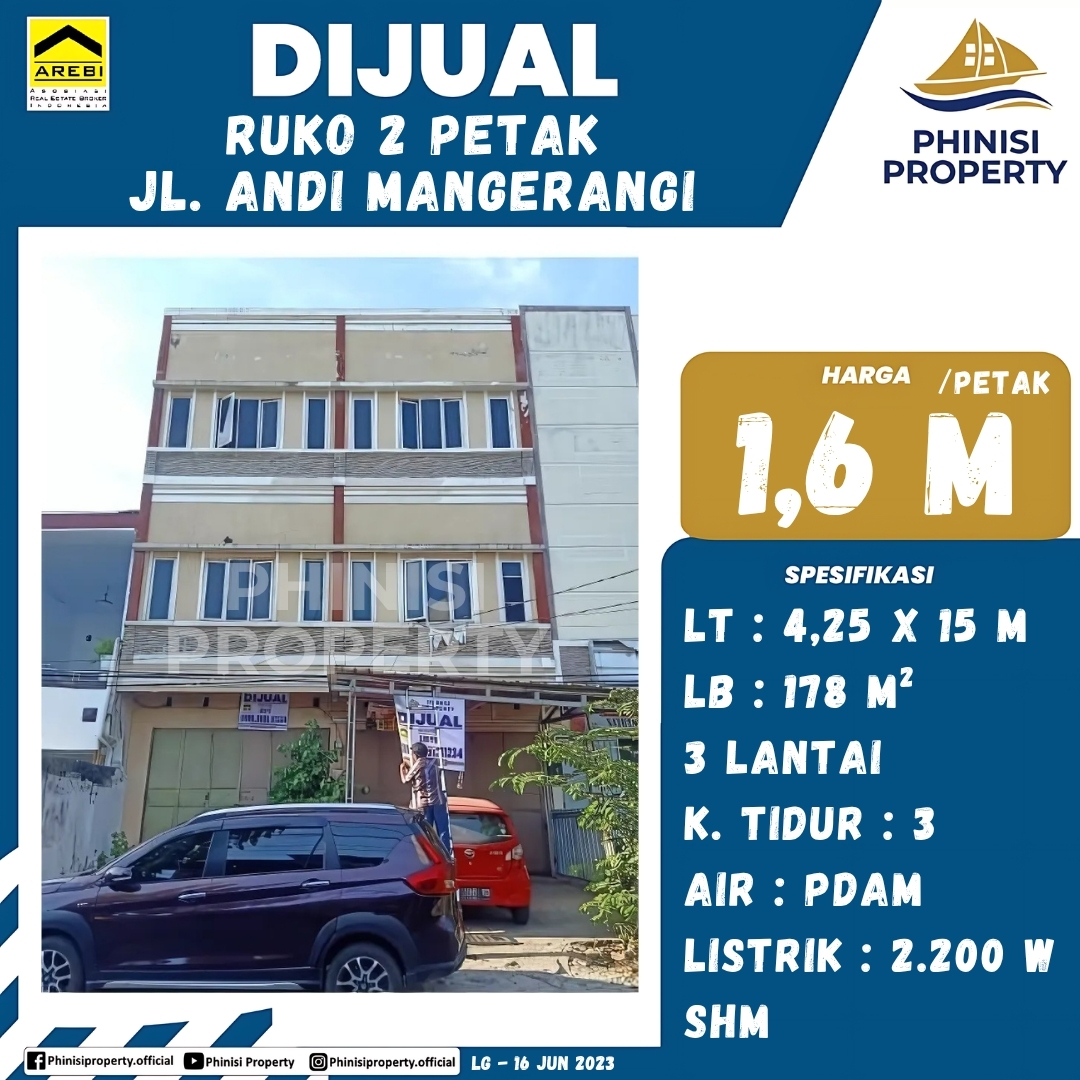 Mencari properti komersial yang menjanjikan di pusat kota Makassar? Tersedia ruko 2 petak yang dijual di Jalan Andi Mangerangi, lokasi yang sangat strategis dan ramai. Ruko 3 lantai ini memiliki luas tanah (LT) 4,25 x 15 meter dan luas bangunan (LB) 178 m 2 , ideal untuk berbagai jenis usaha atau kantor. Dilengkapi dengan 3 kamar tidur, pasokan air PDAM, dan listrik 2.200 W, properti ini menawarkan fasilitas yang memadai untuk operasional bisnis. Dengan status Sertifikat Hak Milik (SHM) yang menjamin legalitas, ruko ini merupakan investasi cerdas dengan harga 1,6 Miliar Rupiah. Jangan lewatkan kesempatan memiliki aset berharga di lokasi premium ini.