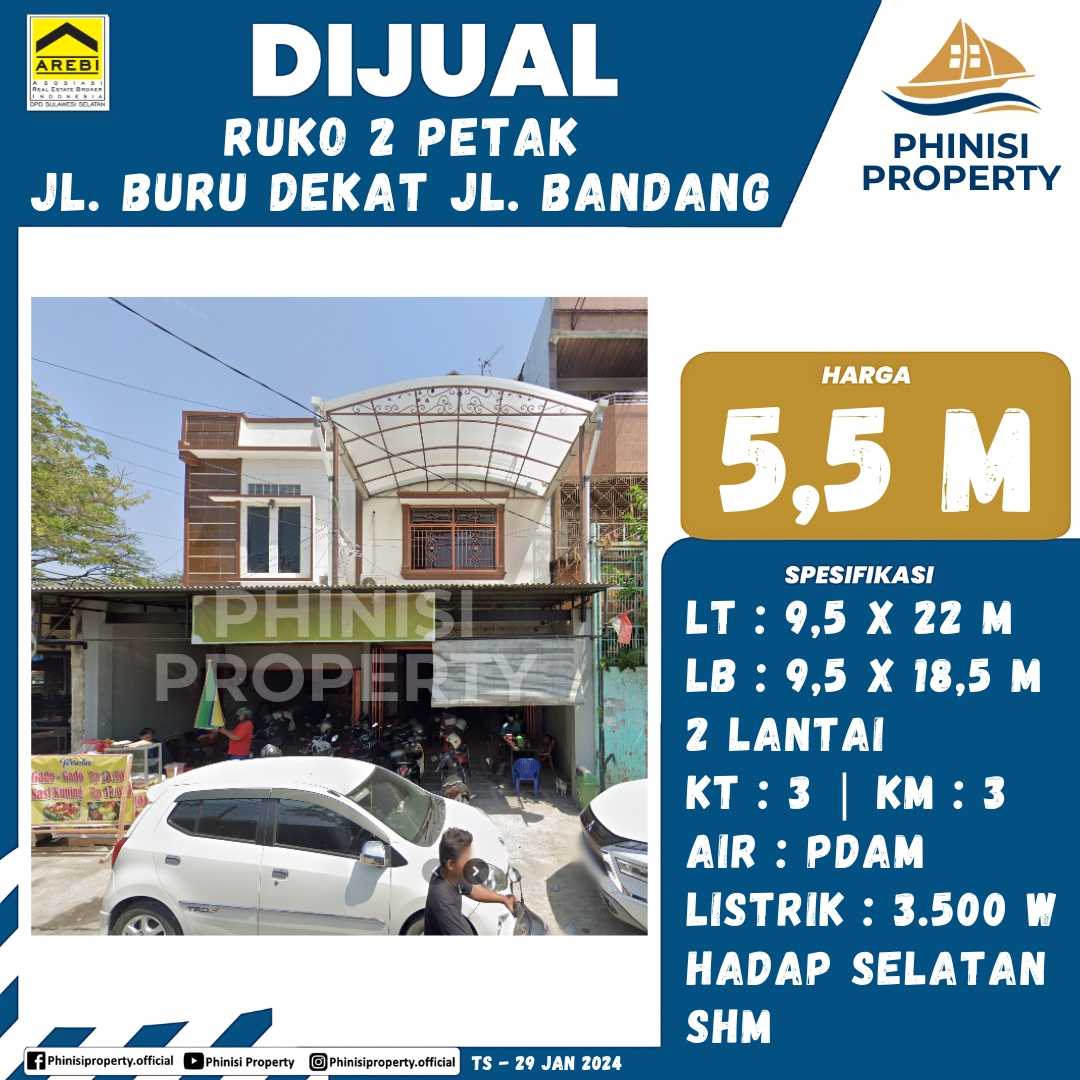 Ruko dua petak yang strategis ini berlokasi di Jl. Buru, dekat dengan Jl. Bandang, Makassar, menjadikannya pilihan ideal untuk berbagai jenis bisnis. Bangunan dua lantai ini memiliki spesifikasi luas tanah 9,5 meter x 22 meter, dengan total luas 209 m², dan luas bangunan 9,5 meter x 18,5 meter, atau setara dengan 175,75 m². Properti ini dilengkapi dengan 3 kamar tidur dan 3 kamar mandi, didukung oleh air PDAM dan listrik 3.500 watt. Menghadap ke selatan, ruko ini memberikan akses dan visibilitas yang sangat baik, serta berstatus kepemilikan Sertifikat Hak Milik (SHM) yang menjamin keamanan investasi Anda. Dengan lokasinya yang ramai dan strategis, ruko ini sangat cocok untuk membuka usaha atau sebagai aset investasi jangka panjang.