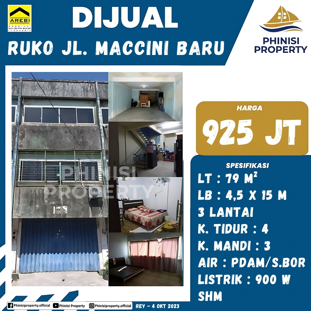 Dijual segera ruko tiga lantai di Maccini Baru, ideal untuk usaha dan tempat tinggal. Properti ini memiliki luas tanah 79 meter persegi dan luas bangunan 4,5×15 meter, dengan empat kamar tidur dan tiga kamar mandi, menawarkan ruang yang sangat fungsional. Dilengkapi dengan daya listrik 900 watt dan pasokan air dari PDAM serta sumur bor, ruko ini siap untuk ditempati. Dengan status kepemilikan SHM, legalitas properti ini terjamin. Jangan lewatkan kesempatan untuk memiliki properti komersial yang menjanjikan di lokasi yang strategis.