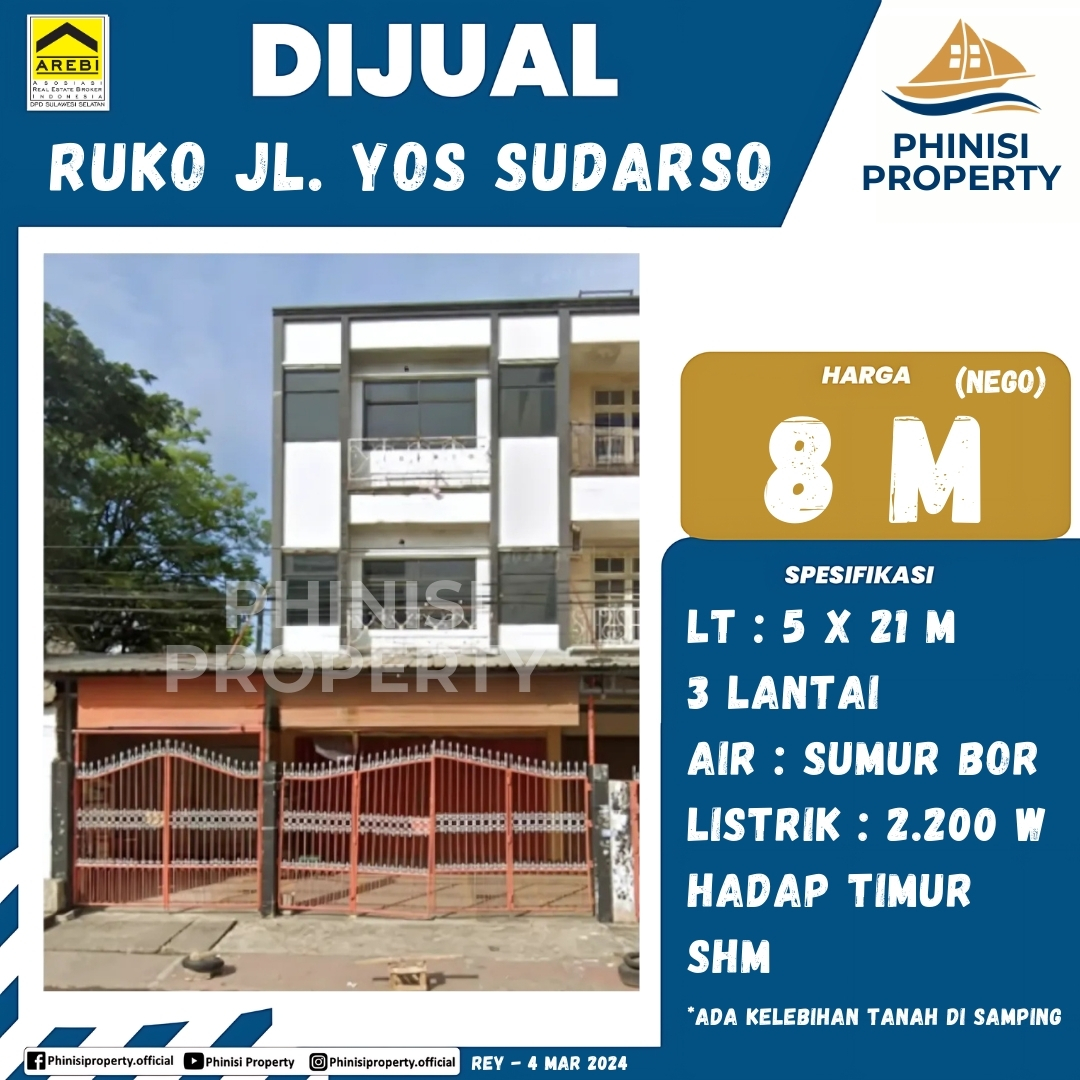 Dijual ruko tiga lantai yang berlokasi strategis di Jalan Yos Sudarso, cocok untuk investasi atau pengembangan bisnis. Dengan luas tanah 5x21 meter, ruko ini menawarkan ruang yang luas dan fungsional. Dilengkapi dengan air sumur bor dan daya listrik 2.200W, properti ini siap digunakan untuk berbagai jenis usaha. Keuntungan tambahan adalah adanya kelebihan tanah di samping. Ruko ini menghadap timur, memiliki visibilitas yang baik, dan bersertifikat SHM.