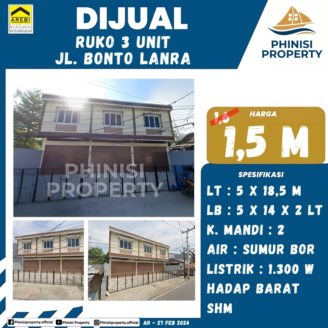 Tersedia ruko di Jalan Bonto Lanra yang sangat ideal untuk investasi maupun pengembangan bisnis. Ruko dua lantai ini memiliki luas tanah 5 x 18,5 meter dan luas bangunan 5 x 14 meter. Dengan dua kamar mandi, daya listrik 1200 watt, dan pasokan air dari sumur bor, ruko ini siap mendukung berbagai kegiatan komersial. Properti ini juga dilengkapi dengan Sertifikat Hak Milik (SHM), menjamin keamanan dan legalitas kepemilikan. Ruko ini adalah pilihan yang tepat bagi Anda yang ingin berinvestasi di lokasi yang strategis dan ramai.