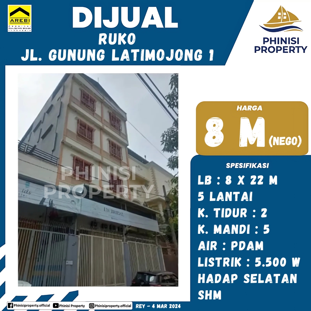 Dijual ruko megah di lokasi strategis Jalan Gunung Latimojong 1, ideal untuk bisnis berskala besar atau investasi jangka panjang. Ruko ini memiliki luas bangunan 8x22 meter dengan lima lantai yang fungsional. Terdapat dua kamar tidur dan lima kamar mandi, menjadikannya sangat fleksibel untuk berbagai keperluan usaha. Dilengkapi dengan air PDAM dan daya listrik 5.500W, properti ini menawarkan kenyamanan dan efisiensi. Ruko ini menghadap selatan dan bersertifikat SHM.