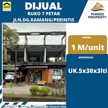 Dijual ruko 7 petak yang berlokasi strategis di Jalan Daeng Ramang/Perintis. Ruko ini memiliki dimensi 5 x 30 meter per unit, dengan total luas per unit 150 meter persegi. Ruko ini terdiri dari 3 lantai, menjadikannya sangat ideal untuk berbagai jenis usaha. Lokasinya yang berada di pinggir jalan besar menjamin potensi bisnis yang tinggi.