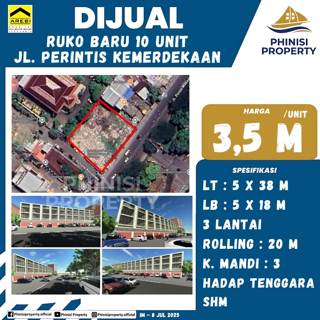 PHINISI PROPERTY dengan bangga mempersembahkan properti komersial yang sangat prospektif: 10 unit ruko baru yang berlokasi strategis di Jl. Perintis Kemerdekaan, Makassar. Ini adalah investasi cerdas bagi Anda yang mencari ruang usaha di area yang ramai, mudah diakses, dan memiliki potensi bisnis yang tinggi, sangat ideal untuk berbagai jenis usaha mulai dari perkantoran hingga ritel.