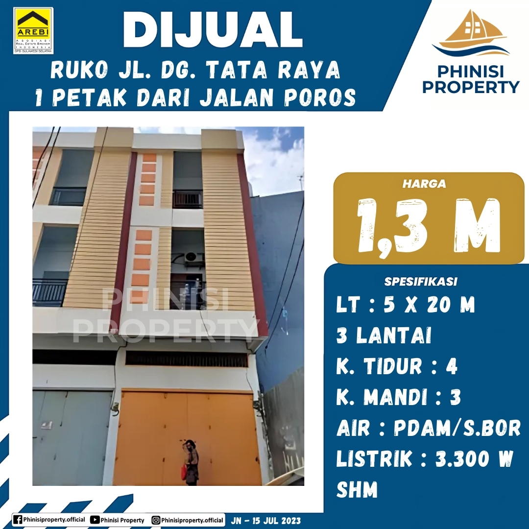 Dijual sebuah ruko yang berlokasi strategis di Jalan Daeng Tata Raya, hanya 1 petak dari jalan poros. Ruko 3 lantai ini memiliki luas 100 meter persegi (5 x 20 meter), dilengkapi dengan 4 kamar tidur dan 3 kamar mandi. Tersedia pasokan air dari sumur bor dan PDAM, serta daya listrik sebesar 3.300 Watt. Lokasi yang sangat dekat dengan jalan utama menjadikan properti ini ideal untuk bisnis dan investasi.