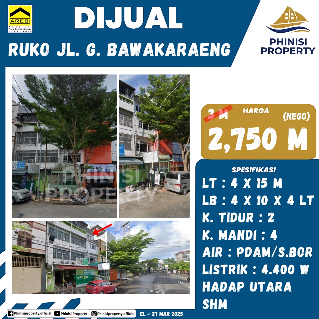 Mencari properti komersial yang menjanjikan di Makassar? Ruko di Jalan Gunung Bawakaraeng ini adalah pilihan yang tepat. Ruko ini memiliki luas tanah 4 x 15 meter dan luas bangunan 4 x 10 meter, terdiri dari 4 lantai. Dilengkapi dengan 2 kamar tidur dan 4 kamar mandi, properti ini menghadap ke Utara. Fasilitas yang tersedia mencakup air PDAM/sumur bor dan listrik 4.400 watt. Dengan Sertifikat Hak Milik (SHM), ruko ini sangat cocok untuk berbagai jenis usaha dan merupakan investasi properti yang sangat menguntungkan di lokasi yang strategis.