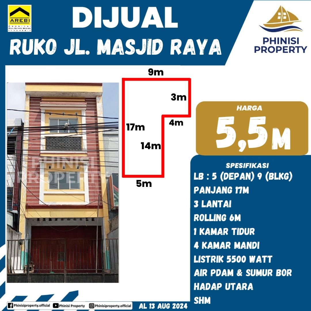 Phinisi Property menawarkan unit ruko siap pakai di kawasan strategisJalan Masjid Raya. Cocok untuk usaha retail, kantor, atau usaha jasa lainnya. Ruko ini berada di lingkungan padat dan aktif, sangat potensial untuk menunjang aktivitas bisnis Anda.