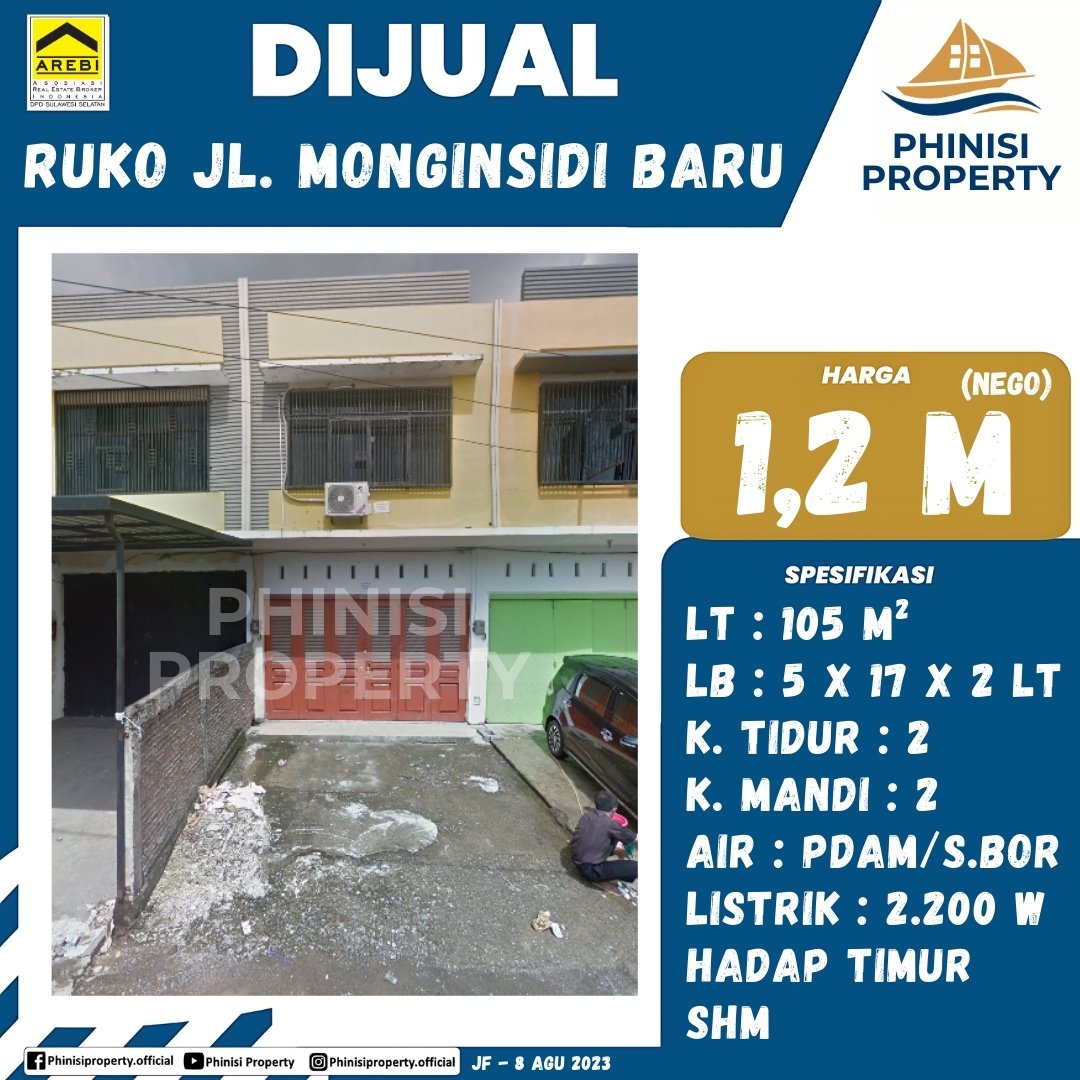 Sebuah ruko di Jalan Monginsidi Baru kini tersedia untuk dijual. Ruko ini berdiri di atas lahan seluas 105 meter persegi dan memiliki luas bangunan 170 meter persegi (5 x 17 meter dikali 2 lantai). Properti ini ideal untuk bisnis dan hunian, dilengkapi dengan dua kamar tidur dan dua kamar mandi. Ruko ini sudah terpasang listrik 2.200 watt dan air dari PDAM atau sumur bor. Menghadap ke timur, ruko ini sudah bersertifikat Hak Milik (SHM), menjamin legalitasnya.