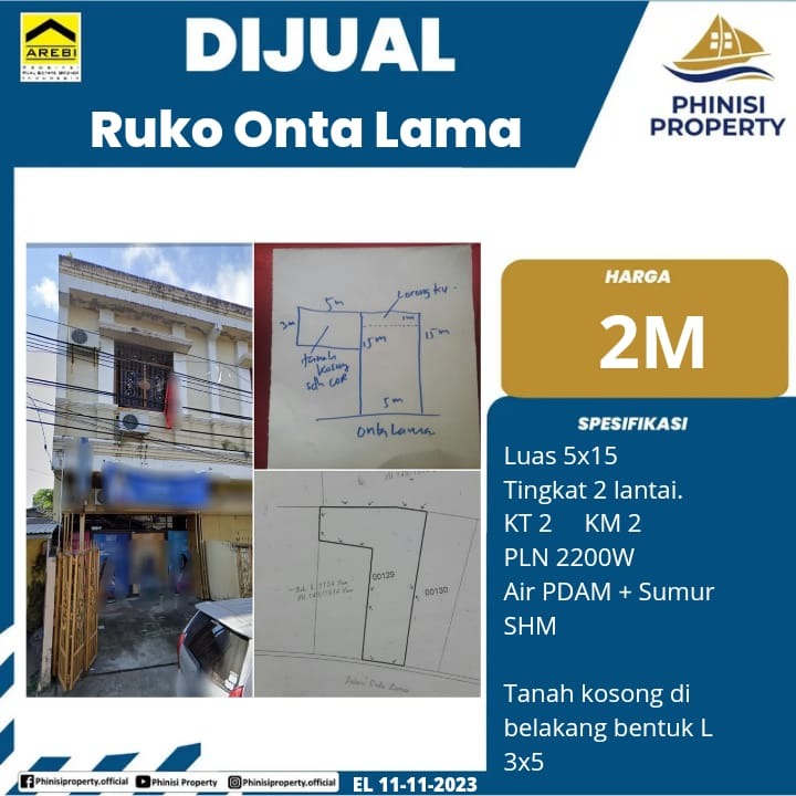 Ruko dijual di Onta Lama ini adalah pilihan investasi yang sangat strategis. Bangunan dua lantai ini memiliki luas tanah 5 x 15 meter atau 75 m² dan luas bangunan 5 x 15 meter atau 75 m², yang sangat cocok untuk tempat usaha sekaligus hunian. Ruko ini memiliki 2 kamar tidur dan 2 kamar mandi. Selain itu, terdapat tanah kosong di belakang ruko dengan bentuk L berukuran 3x5 meter, memberikan ruang ekstra untuk pengembangan. Ruko ini dilengkapi dengan fasilitas air PDAM dan sumur, serta daya listrik 2200W. Legalitasnya pun terjamin dengan Sertifikat Hak Milik (SHM). Properti ini adalah peluang emas untuk memiliki aset di lokasi yang sangat ramai.
