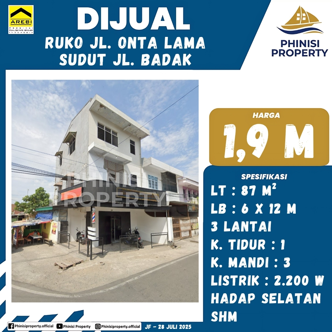 Dijual ruko tiga lantai dengan lokasi sangat strategis di Jalan Onta Lama, sudut Jalan Badak, Makassar. Properti ini berdiri di atas lahan seluas 87 meter persegi. Ruko ini memiliki luas bangunan 6 m x 12 m, dan dirancang fungsional untuk menunjang kegiatan bisnis.