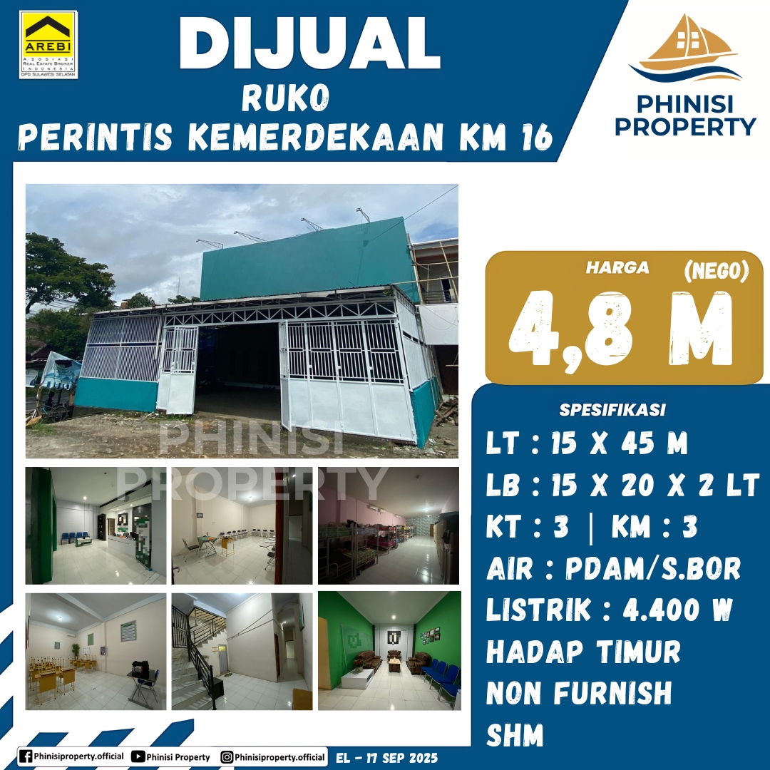 Dijual cepat, sebuah ruko (rumah toko) di lokasi strategis Jalan Perintis Kemerdekaan KM 16. Properti ini dibangun di atas lahan seluas 15×45 meter, dengan total luas tanah 675 meter persegi. Bangunan ruko memiliki luas 15×20 meter dan terdiri dari dua lantai, menjadikannya sangat ideal untuk berbagai jenis usaha. Ruko ini memiliki 3 kamar tidur dan 3 kamar mandi, serta dilengkapi dengan fasilitas air PDAM dan air sumur bor, listrik berdaya 4.400 watt, dan menghadap ke arah timur. Properti dijual dalam kondisi non-furnish (kosong) dan telah memiliki legalitas Sertifikat Hak Milik (SHM).