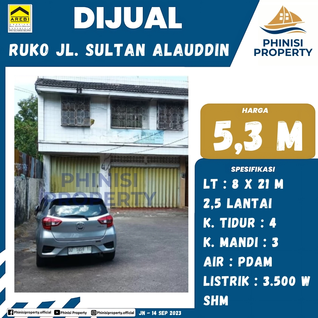 Dijual sebuah ruko yang berlokasi strategis di Jalan Sultan Alauddin. Ruko ini memiliki luas tanah 168 meter persegi (8 x 21 meter) dan terdiri dari 2,5 lantai. Properti ini dilengkapi dengan 4 kamar tidur, 3 kamar mandi, pasokan air PDAM, dan daya listrik 3.500 Watt. Dengan lokasinya yang strategis dan status kepemilikan Sertifikat Hak Milik (SHM), ruko ini sangat cocok untuk dijadikan kantor, tempat usaha, atau investasi jangka panjang.
