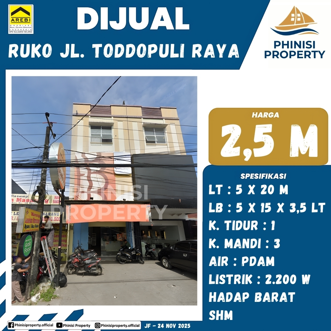 Kembangkan usaha Anda di kawasan komersial yang ramai dan berkembang pesat dengan memiliki ruko dijual di Jalan Toddopuli Raya. Properti bangunan 3,5 lantai ini berdiri di atas lahan seluas 5 x 20 meter dengan dimensi bangunan 5 x 15 meter, memberikan ruang usaha vertikal yang maksimal untuk berbagai jenis bisnis mulai dari perkantoran hingga kuliner. Fasilitas ruko telah dilengkapi dengan 1 kamar tidur dan 3 kamar mandi untuk kenyamanan operasional, serta didukung daya listrik 2.200 Watt dan suplai air bersih PDAM. Dengan posisi menghadap Barat yang memberikan eksposur tinggi serta legalitas SHM yang terjamin, ruko ini adalah aset investasi properti yang sangat menjanjikan di lokasi strategis.