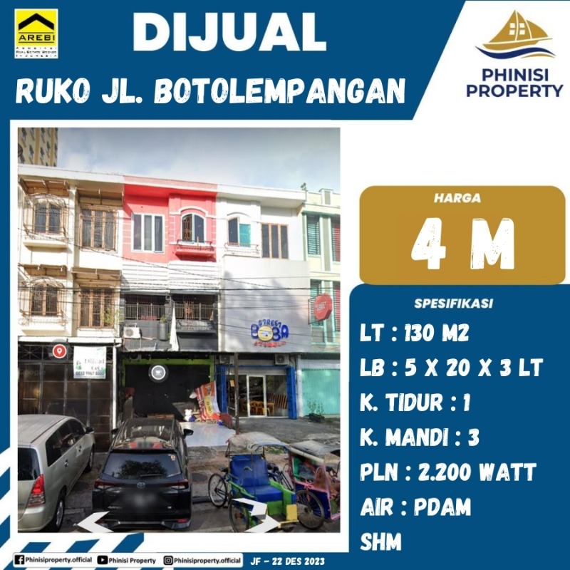 Dijual segera, ruko (rumah toko) di lokasi yang sangat strategis, Jalan Botolempangan, ideal untuk investasi dan kegiatan bisnis. Properti ini berdiri di atas tanah seluas 130 m² dan memiliki luas bangunan 5×20 meter (100 m²) yang terdiri dari tiga lantai. Bangunan ini dilengkapi dengan 1 kamar tidur dan 3 kamar mandi, menawarkan ruang yang cukup untuk kebutuhan usaha dan hunian. Fasilitas listriknya 2.200 Watt, airnya PDAM, dan status kepemilikan sudah SHM (Sertifikat Hak Milik). Lokasi yang berada di pusat keramaian ini menjamin potensi bisnis yang sangat besar.