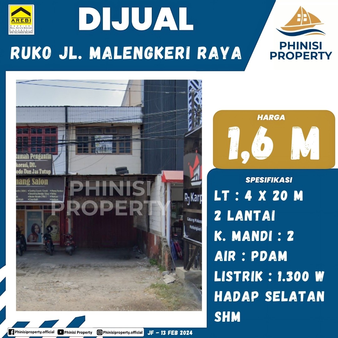 Dijual segera, ruko (rumah toko) strategis di Jalan Malengkeri Raya, sangat ideal untuk bisnis dan hunian. Properti ini berdiri di atas tanah seluas 4×20 meter (80 m²) dan memiliki dua lantai. Ruko ini dilengkapi dengan 2 kamar mandi. Fasilitas yang tersedia mencakup air PDAM dan daya listrik 1.300 Watt. Properti ini menghadap ke arah selatan, menjadikannya pilihan yang baik untuk aktivitas usaha. Dengan status kepemilikan SHM (Sertifikat Hak Milik), properti ini menawarkan investasi yang aman di lokasi yang ramai.