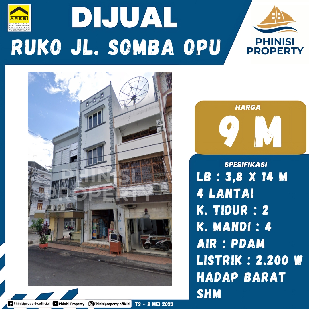 Ruko di Jl. Somba Opu ini menawarkan lokasi komersial yang sangat menjanjikan dan strategis. Dengan luas bangunan 3,8 meter x 14 meter, ruko ini memiliki total luas bangunan 212,8 m² karena terdiri dari 4 lantai. Properti ini sangat fungsional dengan 2 kamar tidur dan 4 kamar mandi, memberikan fleksibilitas untuk penggunaan tempat tinggal maupun bisnis. Ruko ini dilengkapi dengan pasokan air PDAM dan daya listrik 2.200 watt. Menghadap ke barat, ruko ini mendapatkan pencahayaan sore hari yang optimal dan memiliki legalitas Sertifikat Hak Milik (SHM) yang terjamin. Dengan lokasinya yang ramai dan spesifikasi yang lengkap, properti ini adalah pilihan investasi yang sangat menarik untuk berbagai jenis usaha.