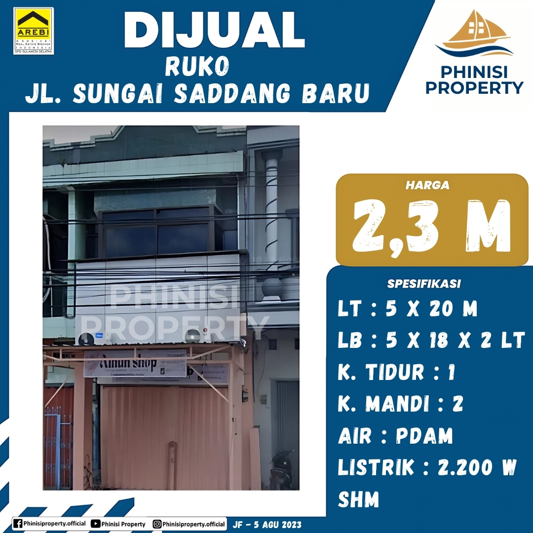 Dijual segera, ruko (rumah toko) yang strategis di Jl. Sungai Saddang Baru. Properti ini sangat ideal untuk usaha dan hunian sekaligus, berada di lokasi yang ramai dan mudah diakses. Bangunan ini berdiri di atas tanah seluas 5×20 meter (100 m²) dan memiliki luas bangunan 5×18 meter (90 m²) yang terdiri dari dua lantai. Ruko ini dilengkapi dengan 1 kamar tidur dan 2 kamar mandi, fasilitas air PDAM, serta daya listrik 2.200 Watt. Dengan status kepemilikan SHM (Sertifikat Hak Milik), properti ini menawarkan kesempatan investasi yang aman.