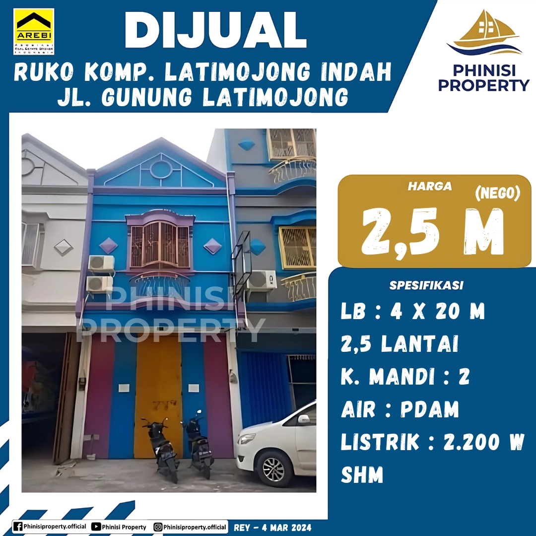 Dijual ruko strategis di Kompleks Latimojong Indah, Jalan Gunung Latimojong, yang ideal untuk berbagai keperluan bisnis. Dengan luas bangunan 4x20 meter yang terdiri dari 2,5 lantai, ruko ini dilengkapi dengan dua kamar mandi, pasokan air PDAM, dan daya listrik 2.200W. Lokasinya yang berada di area kompleks bisnis menjamin akses dan visibilitas yang baik bagi calon pelanggan. Properti ini bersertifikat SHM.