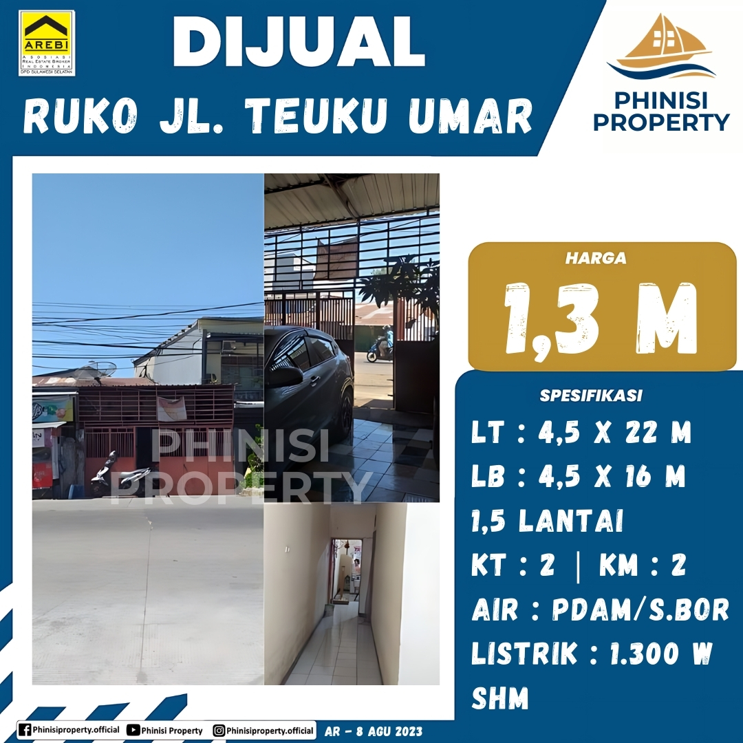 Properti komersial yang ideal untuk bisnis Anda kini tersedia di Jalan Teuku Umar. Dijual ruko 1,5 lantai dengan luas tanah 4,5 x 22 meter dan luas bangunan 4,5 x 16 meter. Ruko ini dilengkapi dengan 2 kamar tidur dan 2 kamar mandi, sangat cocok untuk kantor sekaligus hunian. Ketersediaan air PDAM dan sumur bor, serta daya listrik 1.300 watt, menjamin kelancaran operasional. Properti ini sudah bersertifikat SHM, memberikan jaminan legalitas penuh bagi pembeli.