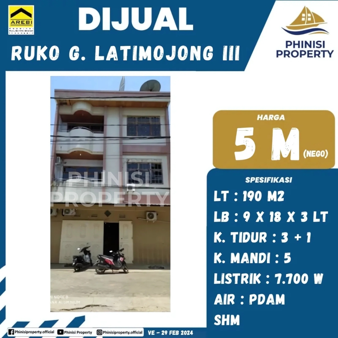 Raih kesempatan emas untuk memiliki ruko strategis di Jalan G. Latimojong III, Makassar. Properti komersial ini menawarkan luas tanah 190 M2 dengan bangunan tiga lantai seluas 9 x 18 M per lantai, sangat ideal untuk berbagai jenis usaha atau investasi. Dilengkapi dengan 3+1 kamar tidur, 5 kamar mandi, daya listrik 7.700 W, dan pasokan air PDAM, ruko ini siap menunjang operasional bisnis Anda. Dengan harga 5 M (nego) dan status kepemilikan SHM, ruko ini merupakan pilihan cerdas bagi Anda yang mencari properti di lokasi prima dengan potensi keuntungan tinggi di jantung kota Makassar.