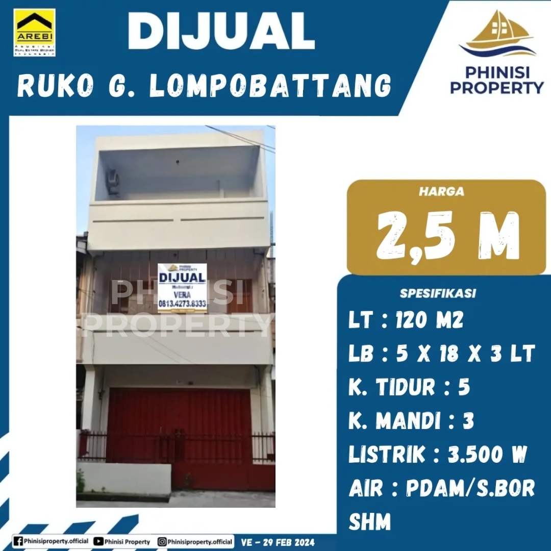 Jelajahi peluang investasi properti komersial yang menguntungkan dengan ruko di Jalan G. Lompobattang, Makassar. Properti ini memiliki luas tanah 120 M2 dan luas bangunan 5 x 18 M yang terbagi dalam tiga lantai, sangat ideal untuk berbagai jenis usaha dan kegiatan bisnis. Dilengkapi dengan 5 kamar tidur dan 3 kamar mandi, ruko ini menawarkan ruang yang fleksibel untuk kebutuhan operasional maupun akomodasi. Dengan daya listrik 3.500 W dan pasokan air PDAM/Sumur Bor, ruko ini siap mendukung aktivitas bisnis Anda tanpa kendala. Ditawarkan dengan harga 2,5 M dan status kepemilikan SHM, ruko di G. Lompobattang ini merupakan pilihan cerdas bagi Anda yang mencari properti komersial dengan nilai investasi tinggi di salah satu lokasi paling hidup di Makassar. Hubungi Vera di 0813.4273.8333 untuk informasi lebih lanjut.