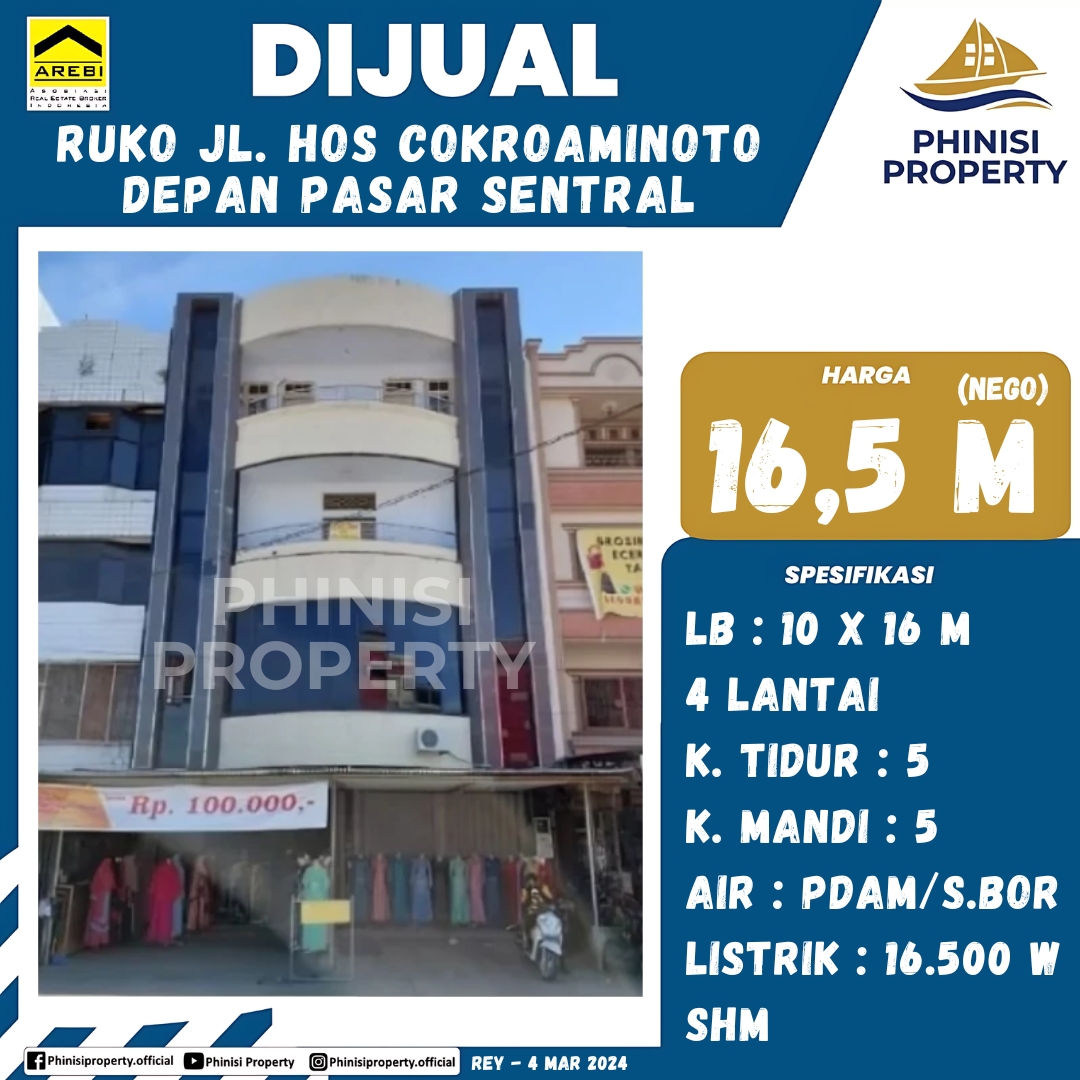 Dijual ruko strategis di Jalan Hos Cokroaminoto, tepat di depan Pasar Sentral, menjadikannya lokasi sempurna untuk bisnis yang ramai. Ruko empat lantai ini memiliki luas bangunan 10x16 meter, dilengkapi dengan lima kamar tidur dan lima kamar mandi. Dengan daya listrik super besar 16.500W dan pasokan air PDAM/sumur bor, properti ini ideal untuk berbagai jenis usaha besar. Lokasi yang sangat ramai dan strategis ini menjanjikan potensi keuntungan maksimal.