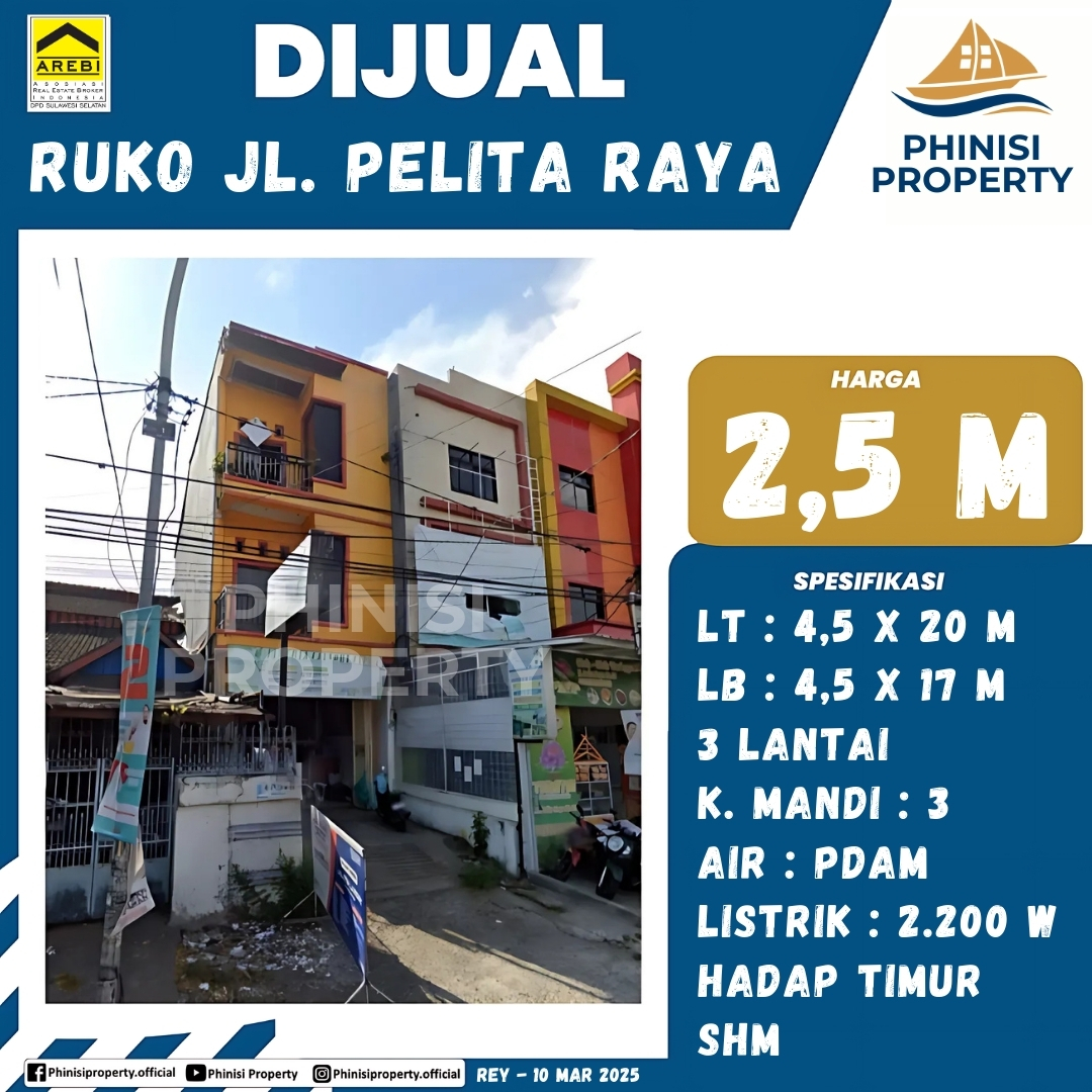 Dijual ruko 3 lantai yang berlokasi strategis di Jl. Pelita Raya, menawarkan peluang bisnis yang menjanjikan di kawasan yang ramai. Properti ini memiliki spesifikasi luas tanah 4,5 x 20 meter dan luas bangunan 4,5 x 17 meter, dilengkapi dengan 3 kamar mandi, fasilitas air PDAM, dan daya listrik 2.200 watt. Dengan sertifikat Hak Milik (SHM) yang menjamin legalitas, ruko ini sangat ideal untuk berbagai jenis usaha, mulai dari perkantoran, butik, hingga retail. Berhadapan dengan timur, ruko ini mendapatkan pencahayaan yang optimal dan visibilitas yang baik. Pilihan investasi yang tepat bagi pengusaha yang mencari lokasi premium dan prospek bisnis yang cerah.