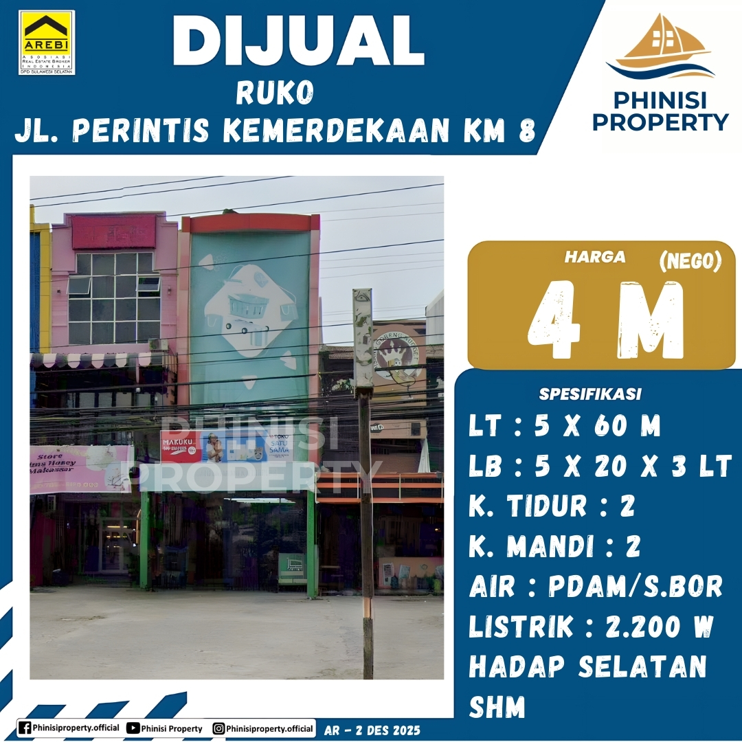 Tingkatkan ekspansi bisnis Anda dengan memiliki ruko strategis tiga lantai yang terletak di Jalan Perintis Kemerdekaan KM 8, jalur komersial utama di Makassar. Ruko ini menawarkan potensi pengembangan luar biasa dengan luas tanah yang sangat panjang (5 x 60 meter) dan luas bangunan 5 x 20 meter di setiap lantainya, menjamin ruang usaha yang maksimal. Unit menghadap Selatan dan berlegalitas SHM, dilengkapi fasilitas penting seperti 2 kamar tidur, 2 kamar mandi, serta didukung sumber air ganda (PDAM/Sumur Bor) dan daya listrik 2.200 Watt, menjadikannya aset investasi properti komersial yang bernilai tinggi dan siap menjadi pusat kegiatan bisnis Anda.