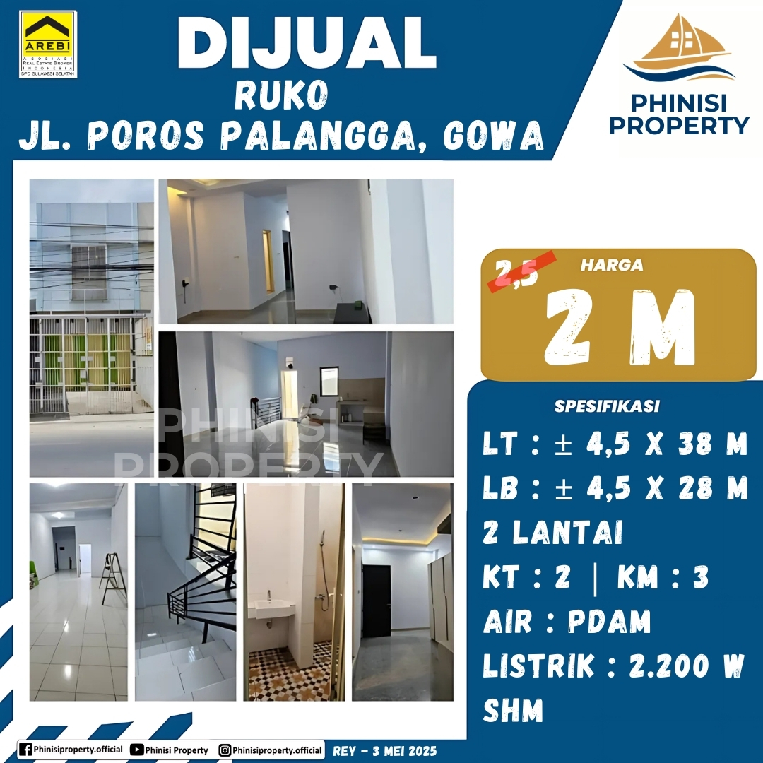 Dijual ruko 2 lantai yang berlokasi strategis di Jl. Poros Palangga, Gowa, menawarkan peluang bisnis yang menjanjikan. Properti ini memiliki spesifikasi luas tanah 4,5 x 38 meter dan luas bangunan 4,5 x 28 meter, menjadikannya ideal untuk berbagai jenis usaha. Dilengkapi dengan 2 kamar tidur, 3 kamar mandi, fasilitas air PDAM, dan daya listrik 2.200 watt, ruko ini siap untuk operasional bisnis Anda. Dengan sertifikat Hak Milik (SHM) yang menjamin legalitas, properti ini merupakan investasi yang aman dan menguntungkan. Lokasinya yang berada di jalur ramai dan berkembang menjadikan ruko ini pilihan sempurna bagi pengusaha yang mencari visibilitas tinggi dan prospek bisnis yang cerah.