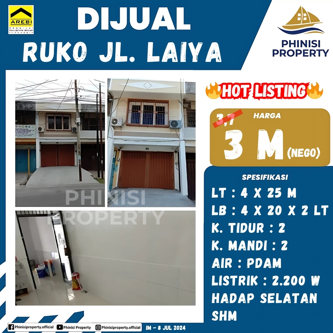 Ruko 2 lantai di Jl. Laiya ini merupakan properti hot listing yang sangat menjanjikan untuk investasi atau bisnis Anda. Dengan dimensi lahan 4 x 25 meter, ruko ini memiliki total luas tanah 100 meter persegi. Bangunannya memiliki luas 4 x 20 meter, yang berarti luas bangunan 80 meter persegi per lantai, menjadikannya sangat fungsional. Ruko ini dilengkapi dengan 2 kamar tidur dan 2 kamar mandi. Fasilitas pendukungnya juga lengkap, termasuk air PDAM dan listrik 2.200 watt. Properti ini menghadap selatan dan sudah bersertifikat Hak Milik (SHM), yang menjamin legalitasnya aman dan terpercaya.